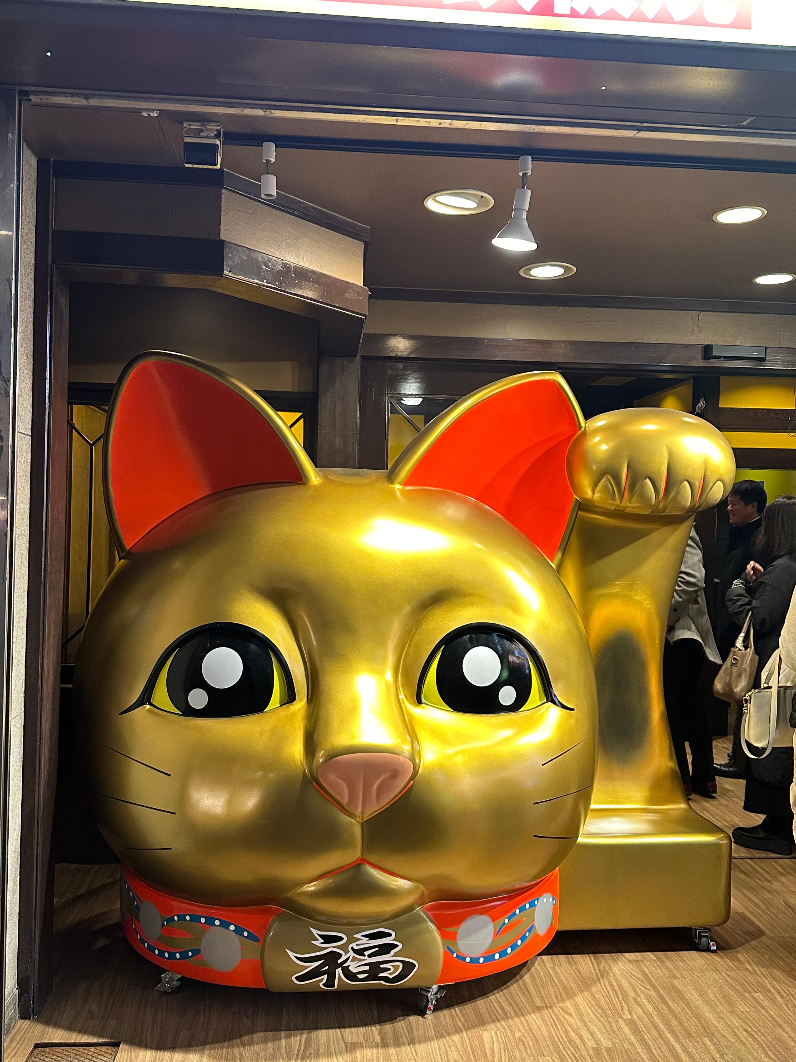 가게 앞에는 엄청나게 큰 황금 고양이 조형물이 서 있었다. 크기가 상당해서 지나치기 어려울 정도였다. 배부르게 먹고 나온 김에 황금 고양이 앞에서 기념사진도 몇 장 찍었다. 이런 독특한 조형물이 있으니까 위치를 찾기도 쉽고, 기억에도 오래 남는다.